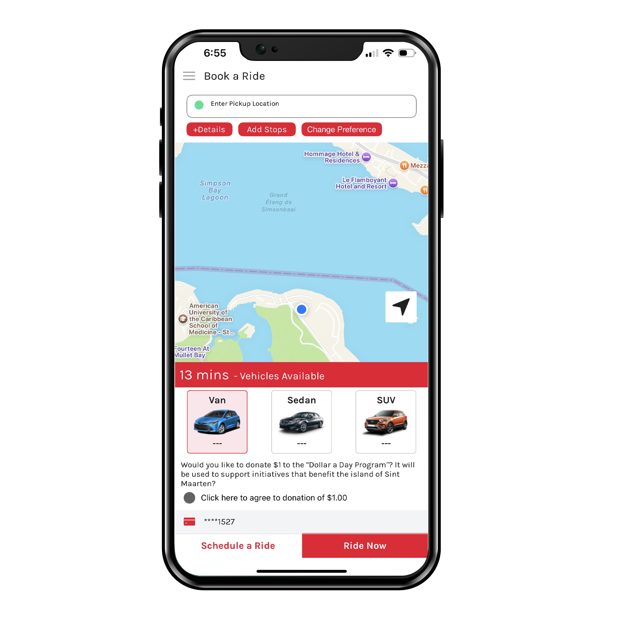 Discover the easiest way to travel around the island with our user-friendly app designed to keep you (The Rider) in mind. Our app offers a range of cool features to ensure you get the best ride every time! With just a few taps, you can get ready for your journey anytime and anywhere in ST. Maarten!